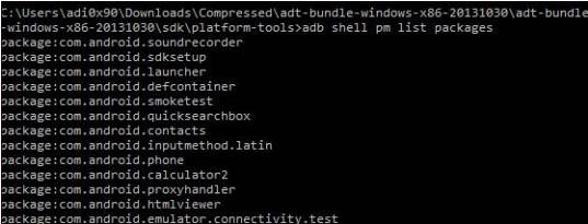 我们还可以使用 pm ( 包管理器) 工具获取所有已安装的软件包的列表,这可以在 ADB 中使用: