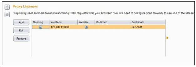 3. 在 Options 选项卡中,我们可以看到默认选项被选中,这是 127.0.0.1:8080 。 这意味着从我们的系统端口 8080 发送的所有流量将由 Burp Suite 拦截并且在它的窗口显示。