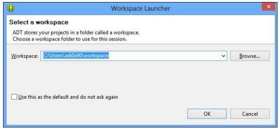 8. 启动时,ADT 包将要求我们配置 Eclipse 的工作区。 workspace ( 工作空间) 是所有Android 应用程序开发项目及其文件将被存储的位置。在这种情况下,我已将所有内容保留默认,并选中 Use this as the default and do not ask me again ( 使用此为默认值,不再询问我) 复选框: