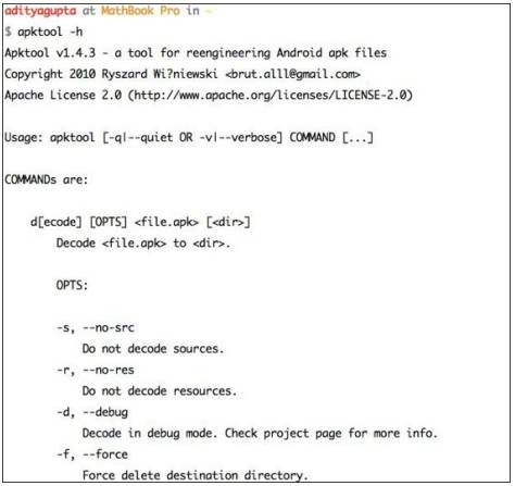 Android 逆向工程中最重要的工具之一是 APKTool。 它为逆向第三方和封闭的二进制 Android 应用程序而设计。 这个工具将是我们在未来章节中的逆向主题和恶意软件分析的重点之一。