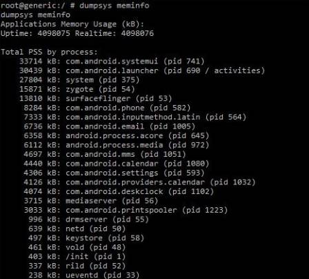 此外,我们可以使用 dumpsys meminfo 然后是 adb shell 命令,获取所有应用程序及其当前内存占用的列表