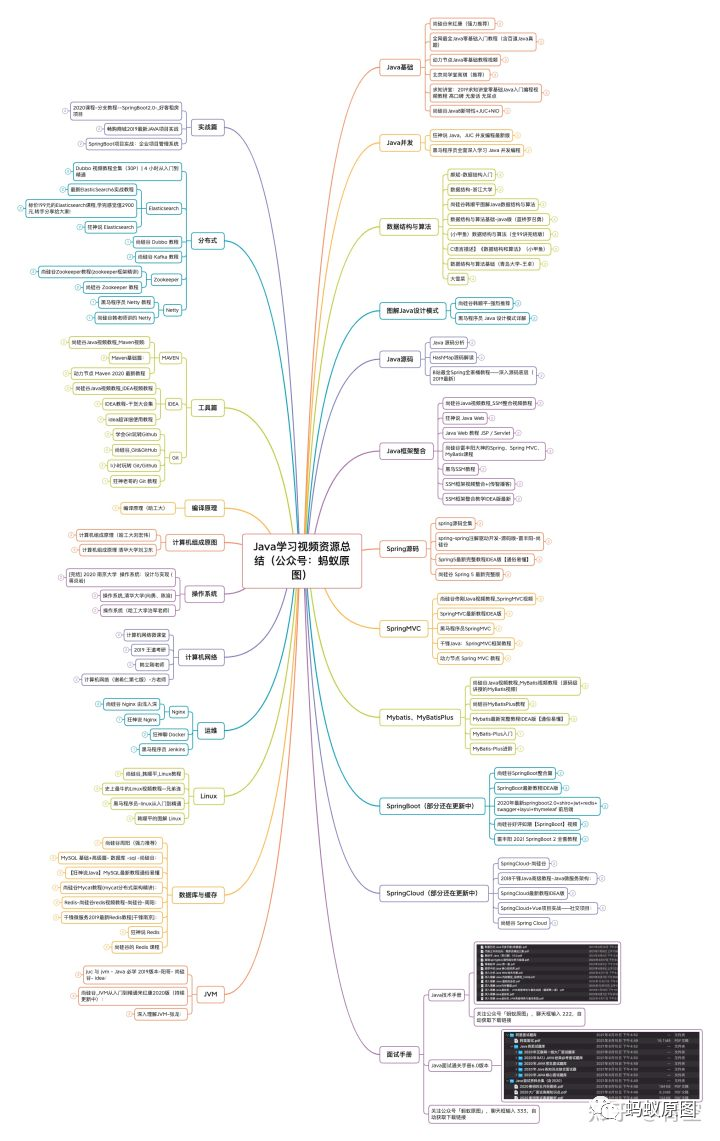 该视频资源思维导图涵盖了Java基础、并发、设计模式、源码解析、数据结构与算法、Spring Boot 、Spring、Spring MVC、Spring Cloud、分布式框架、项目实战、计算机原理、编译原理、数据库、运维、Linux等,基本上Java开发者能用上的都有了。持续更新中……