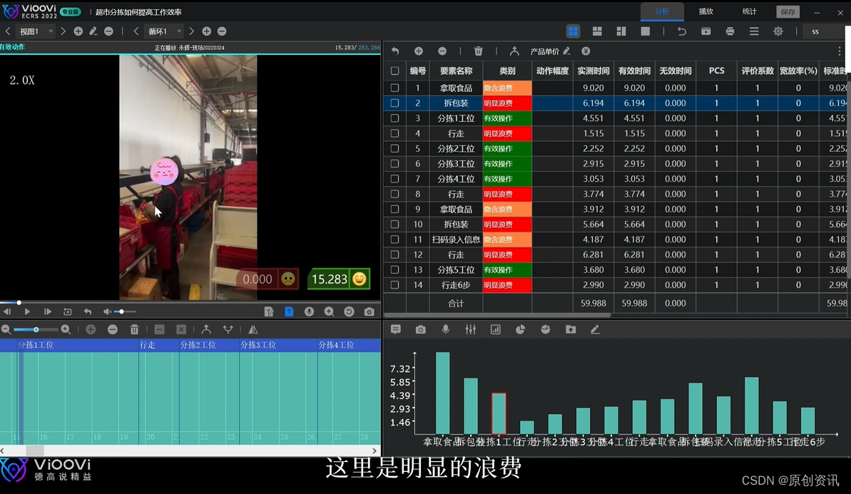 如在一些超市的分拣区域,也会发生这样的现象。(如图VIOOVI ECRS的分拣作业分析)在这样的情况之下布局就是相当不合理的,还有很大的提升空间,完全可以想办法去改善,所以建议各位可以把加工顺序安排完毕,这样能够让生产过程更加顺利的完成,尽可能的不要去移动,这样路线就会缩短,也不会对物品产生一定的影响,就可以节省一定的成本,这样才叫做精益生产改善的彻底方法深度改善一下,这对于提升企业的基础效能来说是至关重要的。