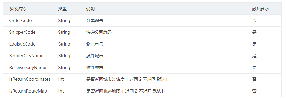 { "IsReturnCoordinates":1, "OrderCode":"", "ShipperCode":"YTO", "LogisticCode":"YT85", "SenderCityName":"泉州市", "ReceiverCityName":"亳州市" }