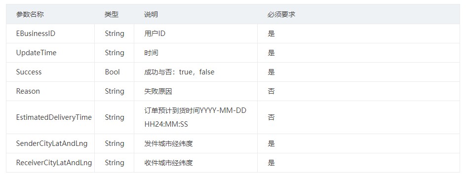 讯享网{ "EBusinessID":"", "UpdateTime":"2016-08-09 16:42:38", "Success":true, "Reason":"", "SenderCityLatAndLng":"113.88308,22.55329", "ReceiverCityLatAndLng":"113.88308,22.55329" }