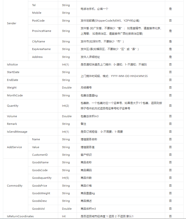 { "ShipperCode":"SF", "OrderCode":"SF", "LogisticCode":"76", "PayType":"1", "ExpType":"1", "CustomerName":"", "CustomerPwd":"", "MonthCode":"", "IsNotice":"0", "Sender":{ "Name":"", "Tel":"", "Mobile":"", "ProvinceName":"广东省", "CityName":"深圳市", "ExpAreaName":"福田区", "Address":"测试地址" }, "Receiver":{ "Name":"", "Tel":"", "Mobile":"", "ProvinceName":"广东省", "CityName":"深圳市", "ExpAreaName":"龙华新区", "Address":"测试地址2" }, "Commodity":[ { "GoodsName":"书本" } ], "IsReturnCoordinates": 1 }