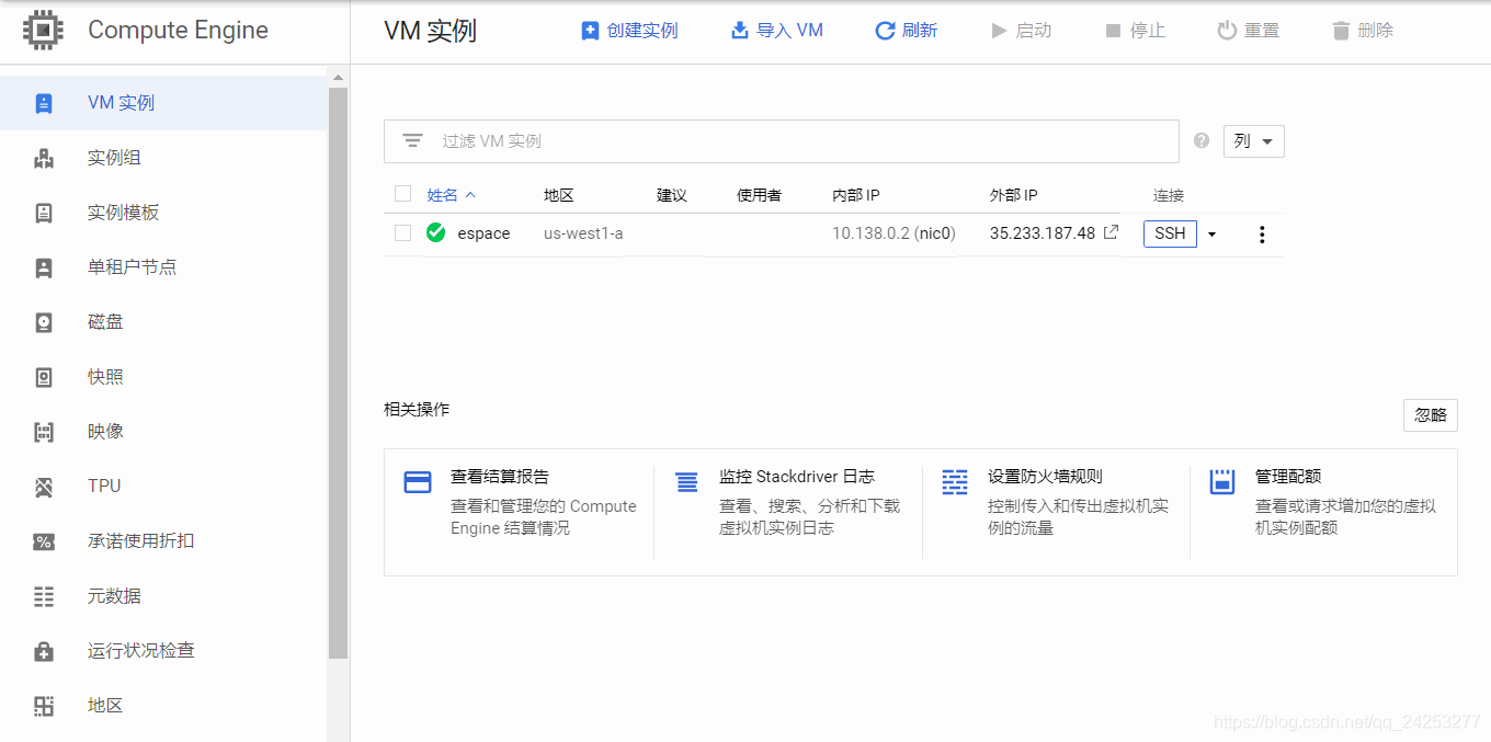 配置完成后如下图所示,会得到系统分配的IP地址 ,然后就可以通过点击WEB端的SSH进行连接,会打开一个新的窗口,也可以下载GOOGLE云端控制台的APP进行操作