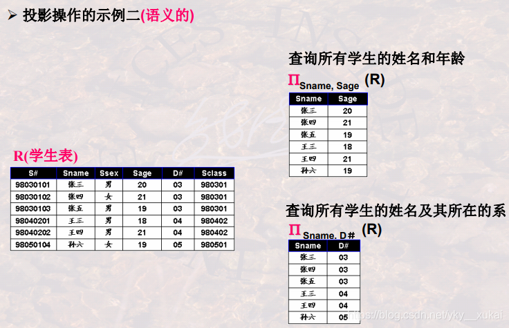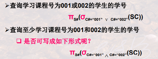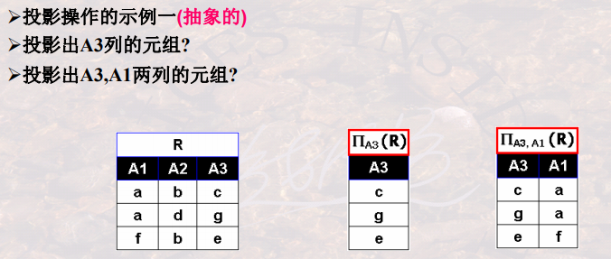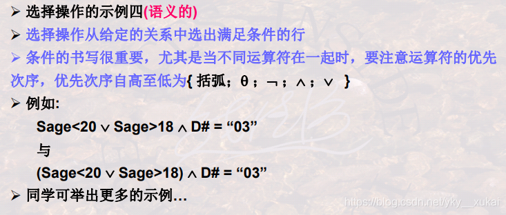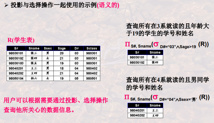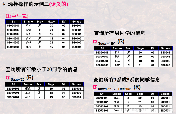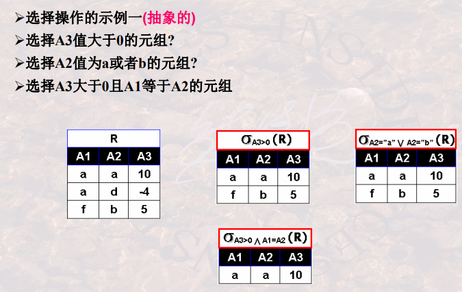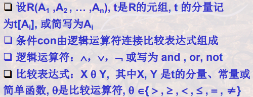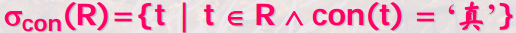 给一个关系R同时给定一个选择的条件condition(简记为con)选择运算的结果也是关系。