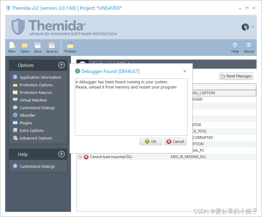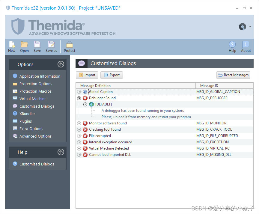 Themida提供了将自定义消息导出到单个文件的可能性,因此可以将它们导入其他项目文件中,而无需再次重新键入所有消息。要将所有消息导出到文件,只需按“导出”按钮,然后选择要在其中保存消息的文件名。当您要将自定义消息导入当前项目文件时,只需按导入按钮,然后选择包含所有自定义消息的文件所在的位置。