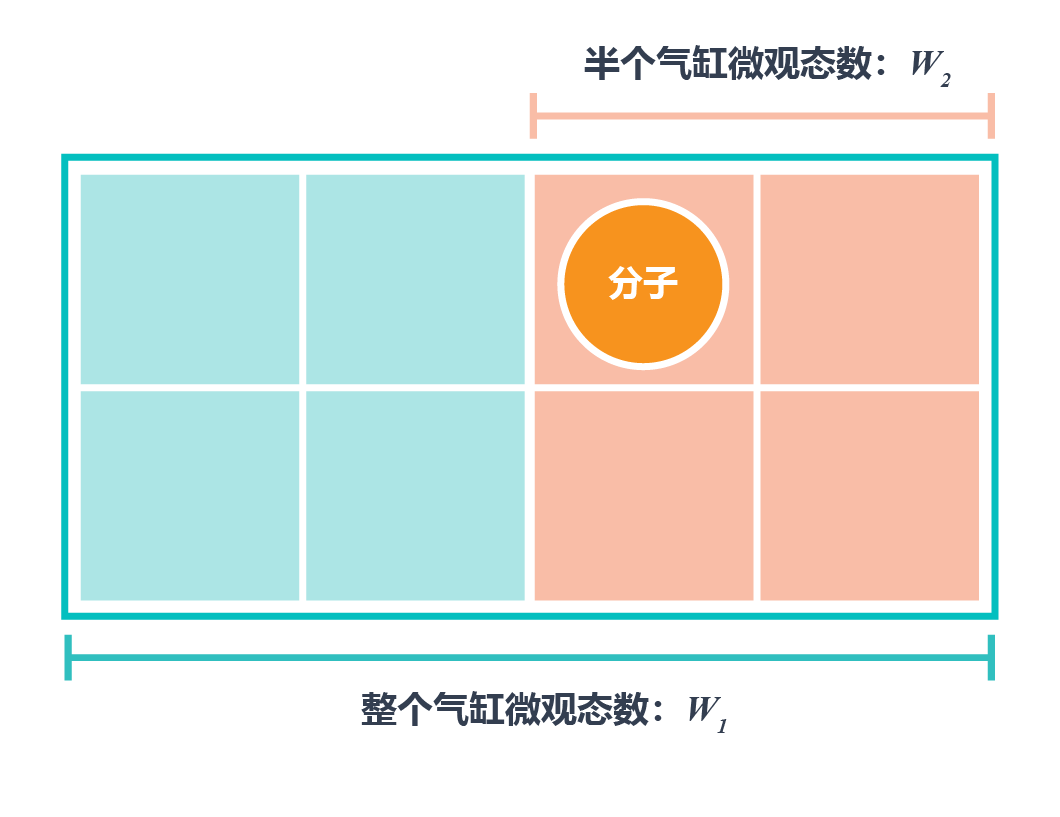 若将气罐分成W1个小空间,该分子则有W1个可能位置,分子的每个可能位置都被视为一个微观状态(microstate)。整个气罐有W1个微观状态,因此半个气罐有W2=W1/2个微观状态。如图,则整个气缸的微观状态数为8个,半个气缸的微观状态数为4个。所有微观状态都被视为相同概率。