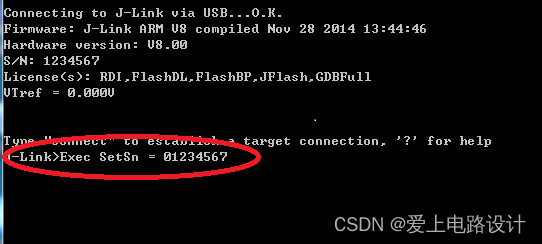将JLINK通过USB线再次与PC机连接,打开第1步安装的JLINK驱动中的J-Link Commander,输入下面的指令“Exec SetSn = 0”回车确认即可。