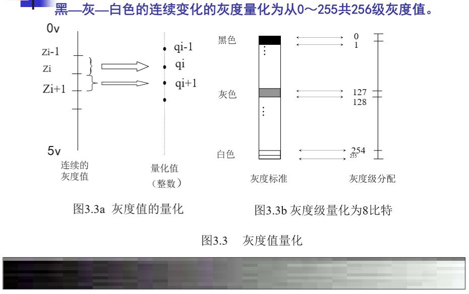 若抽样点(橡素)的连续浓淡值为Zi ,Zi-1 <= Zi < Zi+1,则Zi = qi,即Zi量化为整数qi,qi称为像素的灰度值