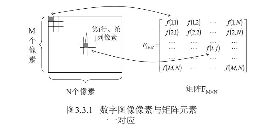 一幅M*N个像素的数字图像,其像素灰度值的排列实际形成了一个M行N列的矩阵F,数字图像中的像素与矩阵元素是一 一对应的