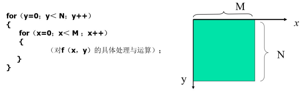 若数字图像的大小为M*N(width*height)个像素,数组元素灰度值为 f(x,y),则C语言处理程序的基本框架为: