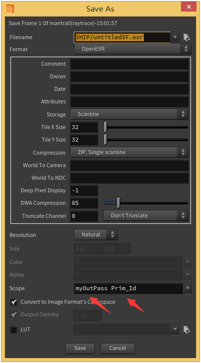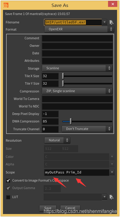 右击save frame也可以把自定义的通道输出出来,可以在scope里选择,默认是渲染图像