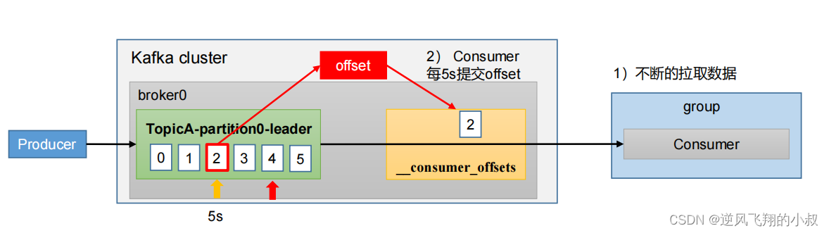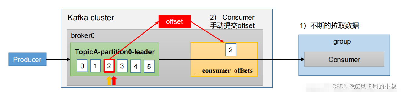 这也就是说,kafka是通过 offset这个值来管理消费组消费进度的,下面是一张关于kafka的offset的原理图;