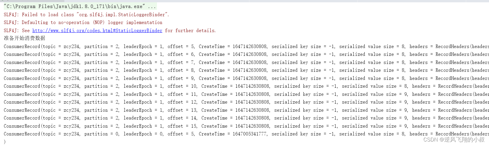讯享网import org.apache.kafka.clients.consumer.ConsumerConfig; import org.apache.kafka.clients.consumer.ConsumerRecord; import org.apache.kafka.clients.consumer.ConsumerRecords; import org.apache.kafka.clients.consumer.KafkaConsumer; import org.apache.kafka.common.TopicPartition; import org.apache.kafka.common.serialization.StringDeserializer; import java.time.Duration; import java.util.ArrayList; import java.util.Arrays; import java.util.Properties; public class OffsetConsumer1 { public static void main(String[] args) { // 1. 创建 kafka 消费者配置类 Properties properties = new Properties(); // 2. 添加配置参数 // 添加连接 properties.put(ConsumerConfig.BOOTSTRAP_SERVERS_CONFIG, "IP:9092"); // 配置序列化 必须 properties.put(ConsumerConfig.KEY_DESERIALIZER_CLASS_CONFIG, "org.apache.kafka.common.serialization.StringDeserializer"); properties.put(ConsumerConfig.VALUE_DESERIALIZER_CLASS_CONFIG, "org.apache.kafka.common.serialization.StringDeserializer"); properties.put(ConsumerConfig.GROUP_ID_CONFIG, "test_group2"); // 是否自动提交 offset properties.put(ConsumerConfig.ENABLE_AUTO_COMMIT_CONFIG, true); // 修改 提交 offset 的时间周期 1000ms,默认情况下为 5s properties.put(ConsumerConfig.AUTO_COMMIT_INTERVAL_MS_CONFIG, 1000); //3. 创建 kafka 消费者 KafkaConsumer<String, String> consumer = new KafkaConsumer<>(properties); //4. 设置消费主题 形参是列表 consumer.subscribe(Arrays.asList("zcy234")); System.out.println("准备开始消费数据"); //5. 消费数据 while (true){ // 读取消息 ConsumerRecords<String, String> consumerRecords = consumer.poll(Duration.ofSeconds(1)); // 输出消息 for (ConsumerRecord<String, String> consumerRecord : consumerRecords) { System.out.println(consumerRecord.value()); } } } }