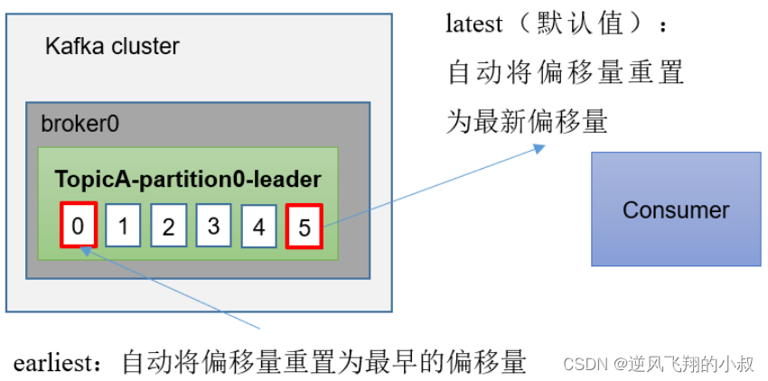 1、 earliest :自动将偏移量重置为最早的偏移量, --from-beginning;