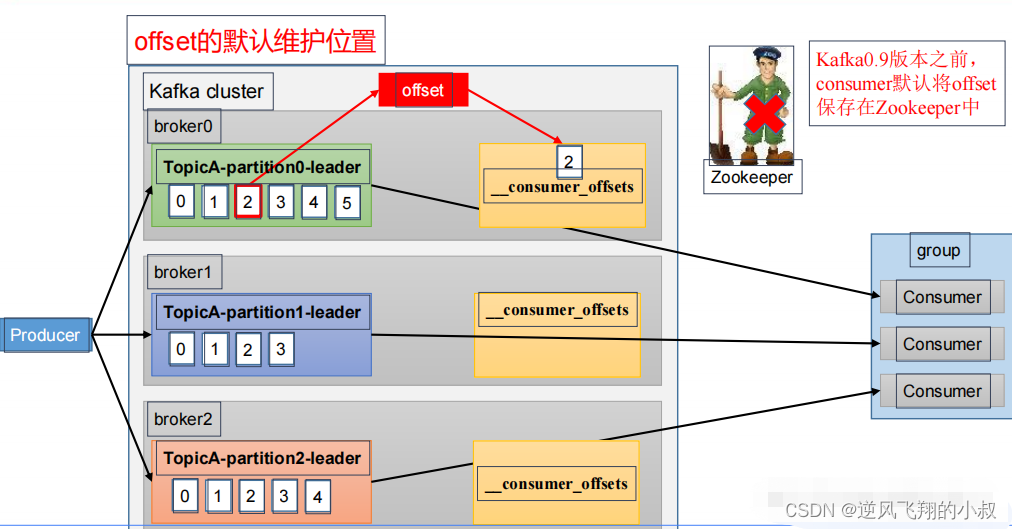 1、从0.9版本开始,consumer默认将offset保存在Kafka ,一个内置的topic中,该topic为__consumer_offsets;
