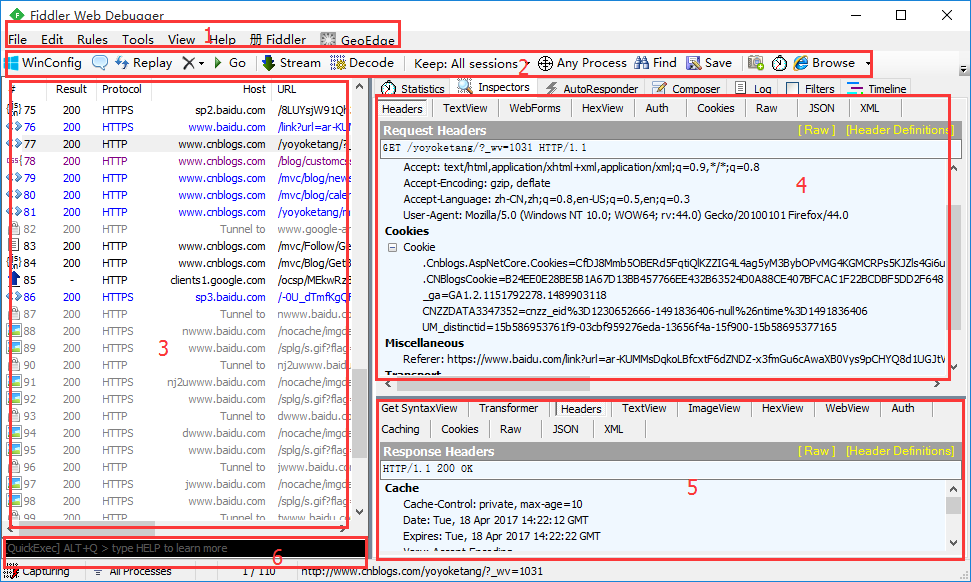 本篇简单的介绍下fiddler界面的几块区域,以及各自区域到底是干什么用的,以便于更好的掌握这个工具