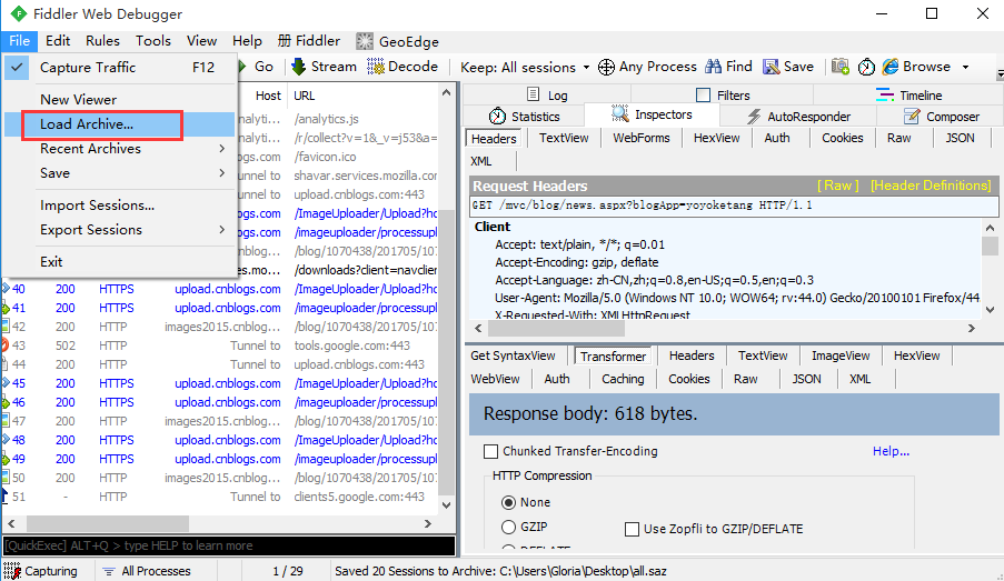 1.我们可以打开fiddler,操作完博客园后,选中save>All Sessions,保存全部会话