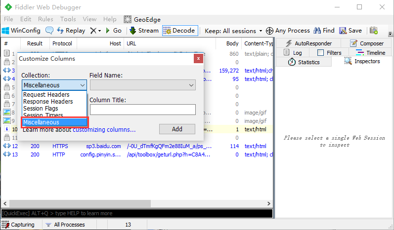 在使用fiddler抓包的时候,查看请求类型get和post每次只有点开该请求,在Inspectors才能查看get和post请求,不太方便。于是可以在会话框直接添加请求方式。
