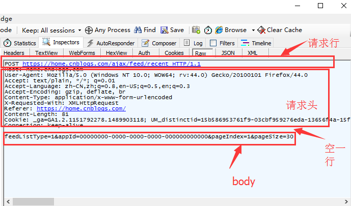 2.下图是fiddler工具抓的post请求报文(工具使用看fiddler篇),可以对照上图,更清楚的理解http的请求报文内容。