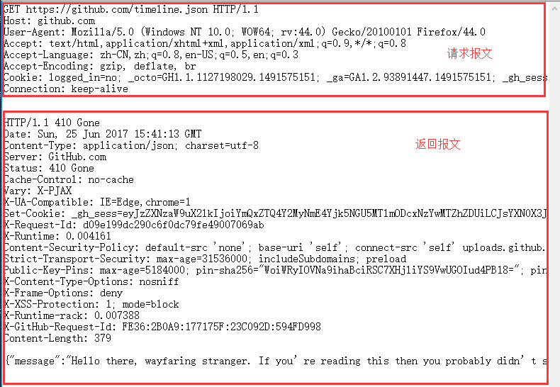 2.以下是请求https://github.com/timeline.json 这个地址后,用fiddler抓包导出为文本,查看完整的http请求内容。(具体操作查看《fiddler 1.10会话保存》)