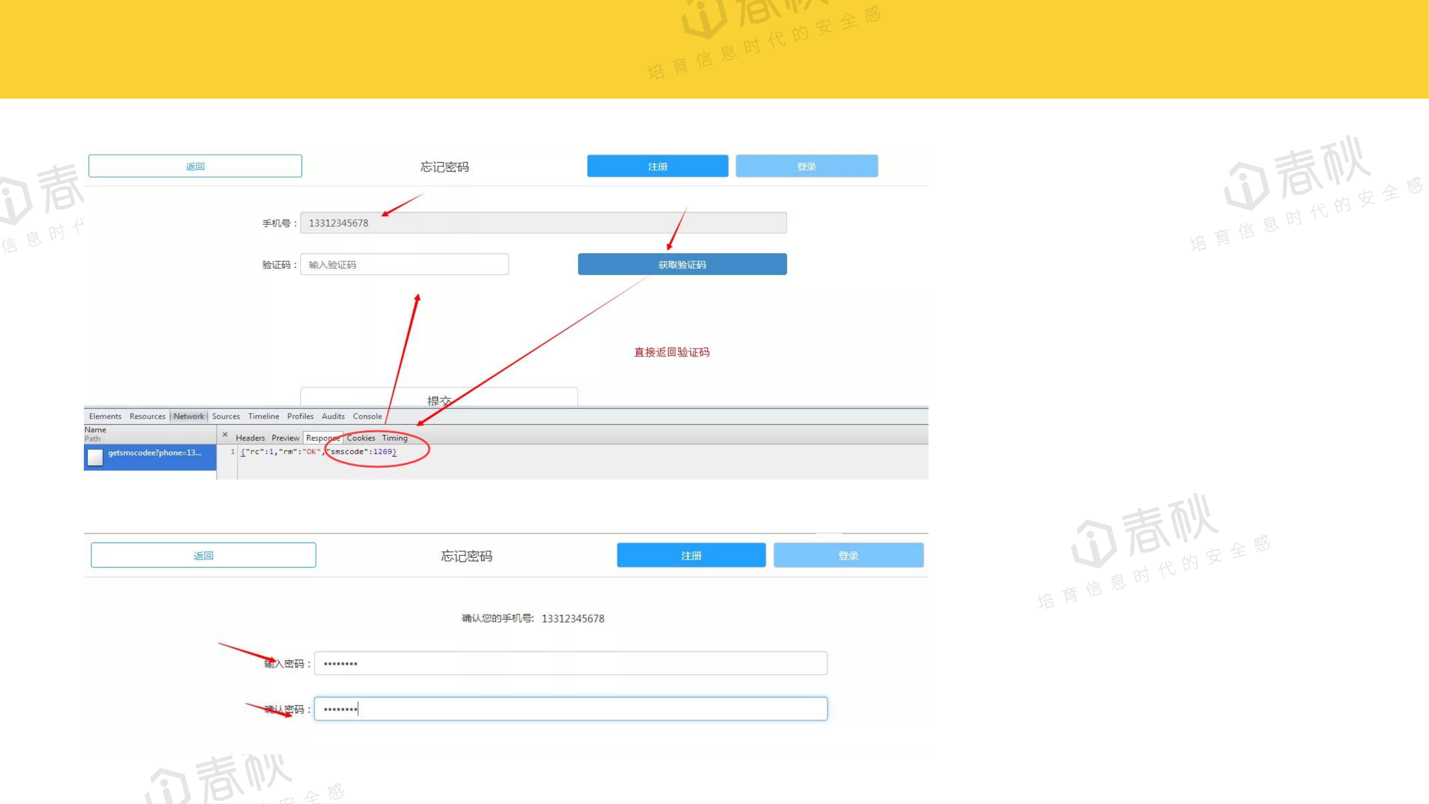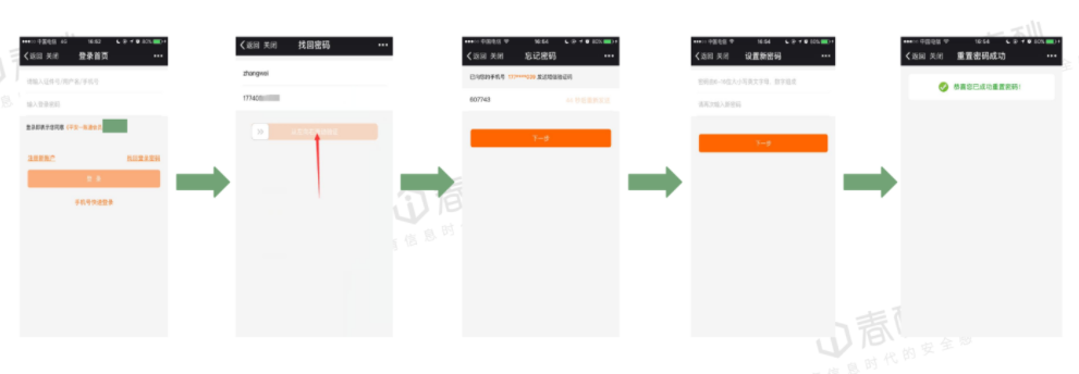 - 测试方法:在提交手机号和验证码的时候,替换手机号为他人手机号进行测试,成功通过验证并重置他人密码。