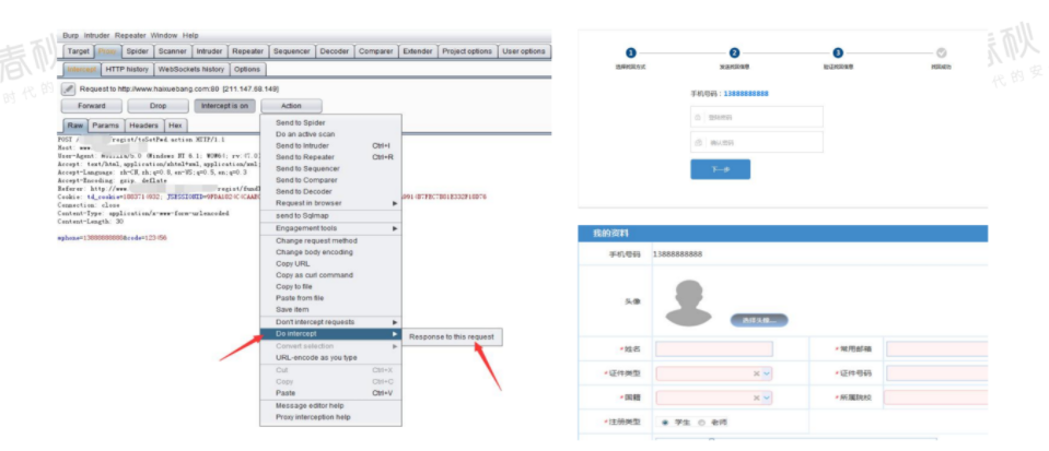 - 测试方法:使用自己的手机号走流程,在走到最后一个设置密码的流程时,修改数据包里的用户信息。
