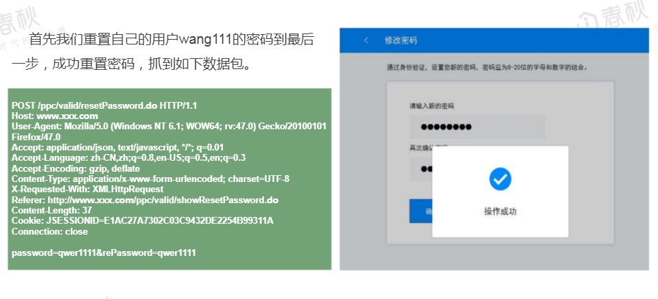 - 造成原因:在整个重置密码的流程中,只对验证码和手机号做了校验,未对后面设置新密码的用户身份做判断,导致在最后一步通过修改用户身份来重置他人的密码。
