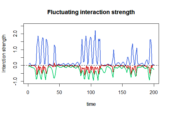 As can be seen in Figure 7 in the main text, interaction strengths fluctuate with time.