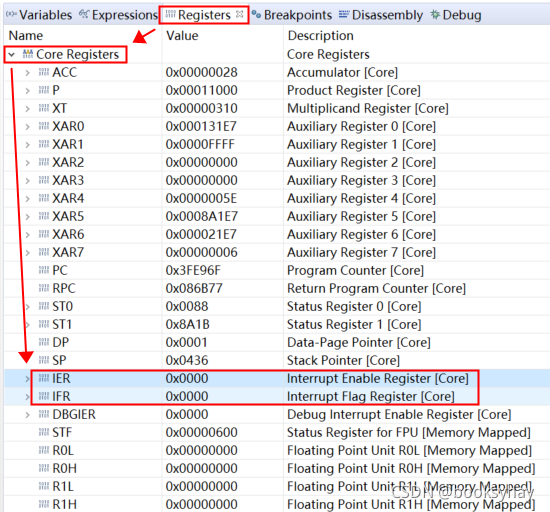 与外设寄存器类似,在CCS的编译环境中,都把这类寄存器当作一个全局变量来处理。