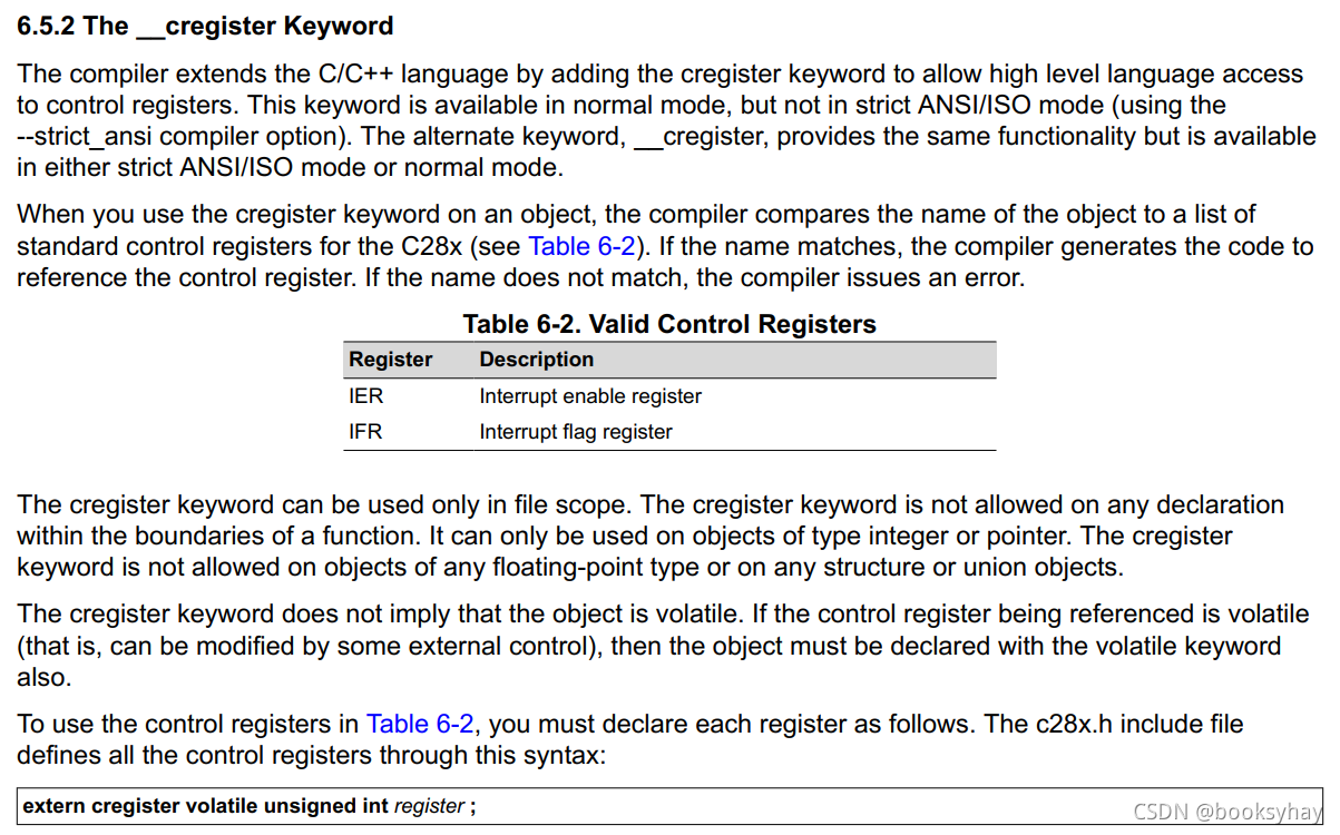 When you use the cregister keyword on an object, the compiler compares the name of the object to a list of standard control registers for the C28x (see Table 6-2). If the name matches, the compiler generates the code to reference the control register. If the name does not match, the compiler issues an error.