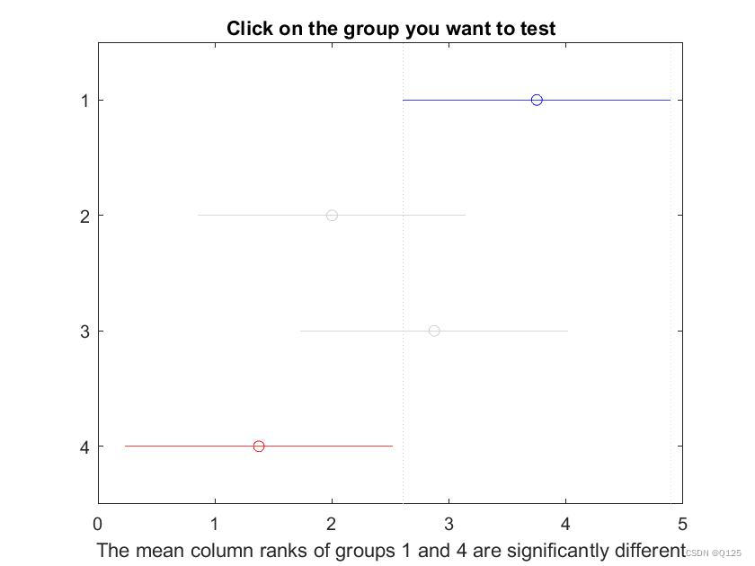 从以上结果可以看出,c矩阵的第3行的第3列和第5列构成的区间不包括0,说明在显著性水平0.05下,可认为A,D两个地区制作的水煮鱼这道菜的品质之间的差异是显著的。进一步可以通过MATLAB生成的Friedman 检验图直观的看出: