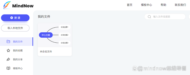 打开MindNow在线创作界面,点击新建按钮新建一个思维导图,当然,MindNow也支持导入其他文件,如果你之前用别的思维导图工具创作的,可以一键导入至MindNow。