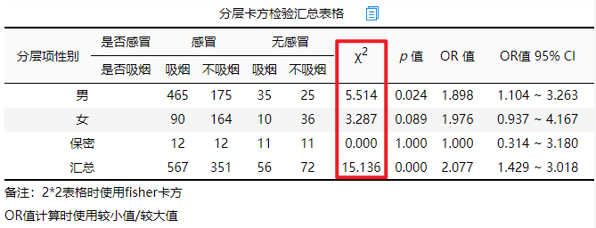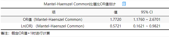 ③ Mantel-Haenszel Common比值比OR值,与单独进行卡方检验时整体OR值并不一致,Mantel-Haenszel Common比值比OR值可理解为校正OR值,但二者意义一致。