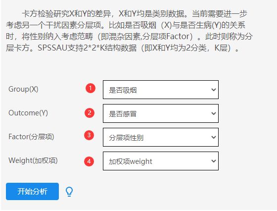 - 针对分层卡方,SPSSAU支持2*2*k结构,即X和Y均为2个类别,如上述中的是否吸烟和是否感冒,k表示分层项的类别数量,(案例中性别分为‘男’,‘女’和‘保密’,则为3层)。