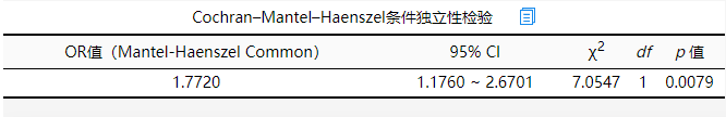 上表格展示比值比齐性检验,默认使用Breslow-Day法进行检验,上表格显示并没有通过比值比齐性检验(χ2=1.089, p=0. 5801>0.1),即意味着各层之间同质,并不存在混杂作用,即不存在混杂因素(性别),即并不需要分别报告各层对应的值(比如OR值),整体报告即可,此处可报告整体的Mantel-Haenszel Common比值比OR值即1.772。