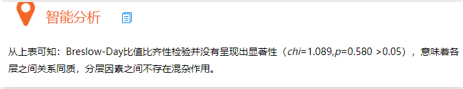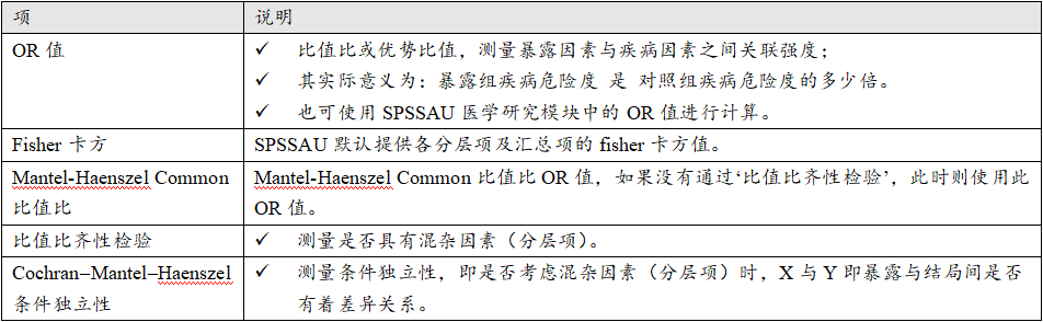 通常情况下,首先查看‘比值比齐性检验’,如果其呈现出显著性(p 值小于0.05),则说明具有混杂因素,即需要考虑分层项,即分别查看不同分层项下的数据结果。反之如果没有通过‘比值比齐性检验’,即说明没有混杂因素不需要考虑分层项,报告整体的结果即可(包括卡方检验,以及OR值)。 Cochran–Mantel–Haenszel条件独立性用于研究考虑混杂因素(分层项)后,X与Y之间是否还存在着差异关系,相对意义较小。
