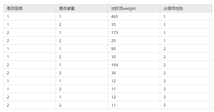 - 加权项weight表示各研究对象类别组合的数量,比如465表示,吸烟且感冒且为男性的数量。