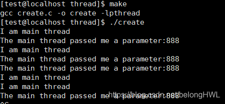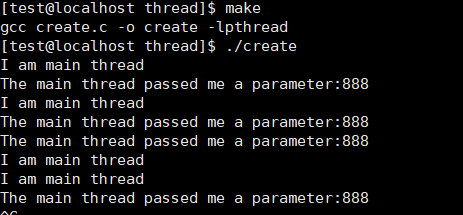 #include<stdio.h> #include<stdlib.h> #include<pthread.h> #include<unistd.h> void *func(void *arg) { while(1) { printf("The main thread passed me a parameter:%d\n",*((int*)(arg))); sleep(1); } return NULL; } int main() { int tmp = 888; pthread_t tid; int ret = pthread_create(&tid, NULL, func, (void*)&tmp); if(ret != 0) { printf("thread create error: %d\n", ret); return -1; } while(1) { printf("I am main thread\n"); sleep(1); } return 0; }
