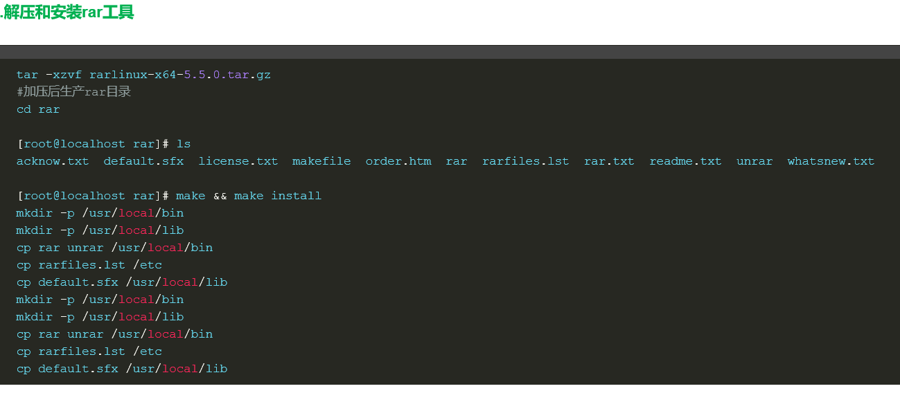 linux中默认的tar命令用于解压压缩文件,但是tar命令不支持rar文件的解压和压缩,需要安装rar解压工具,实现rar命令解压rar压缩包。