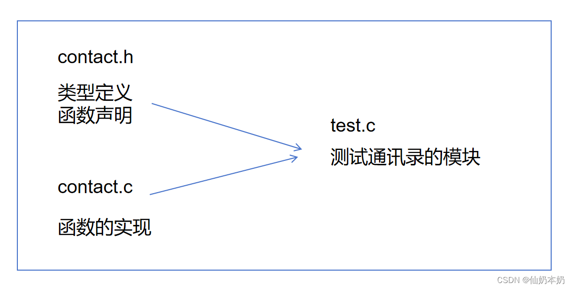 现在我们想用C语言做一个通讯录,借鉴上面的结构,在写代码之前我觉得也要想好一个大致的结构,这样敲代码时就不会一头雾水,云里雾里。