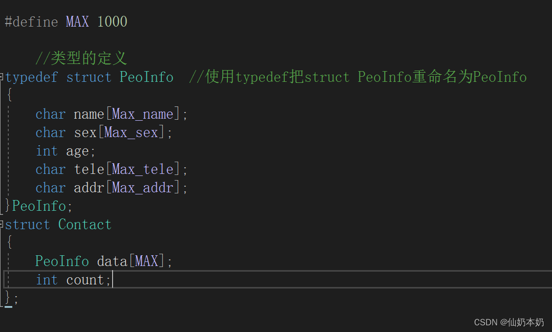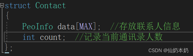 讯享网typedef struct Contact //把struct Contact重命名为Contact { PeoInfo data[MAX]; //存放联系人信息 int count; //记录当前通讯录人数 }Contact;