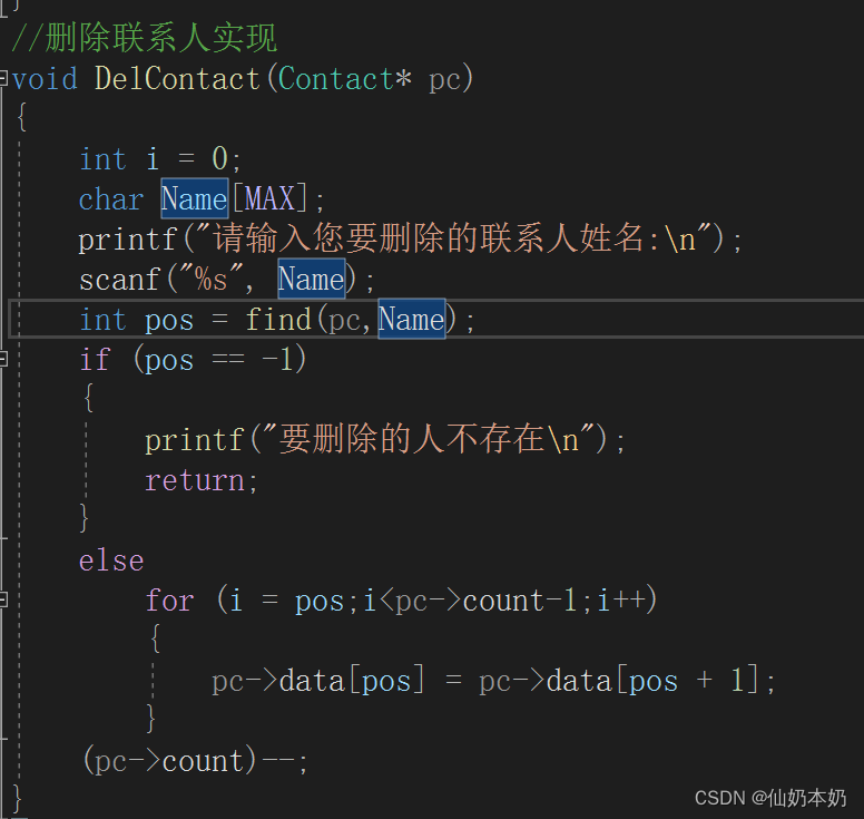 这个for循环直接使后面的数据覆盖掉前面的数据,进而实现了对指定联系人的删除