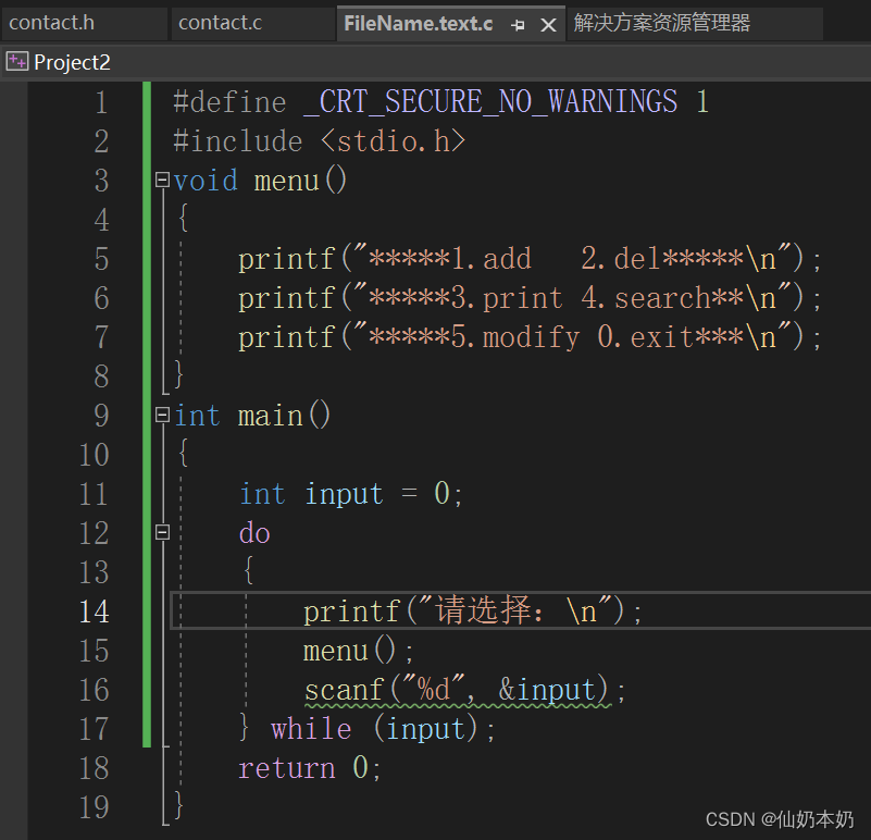 然后我们回到主函数,对于一个程序来说,我们最好为用户提供一个菜单,放到函数中实现,比如选1新建联系人,选2删除联系人。在实际中,我们可能不会只操作一次,因此还要用到循环