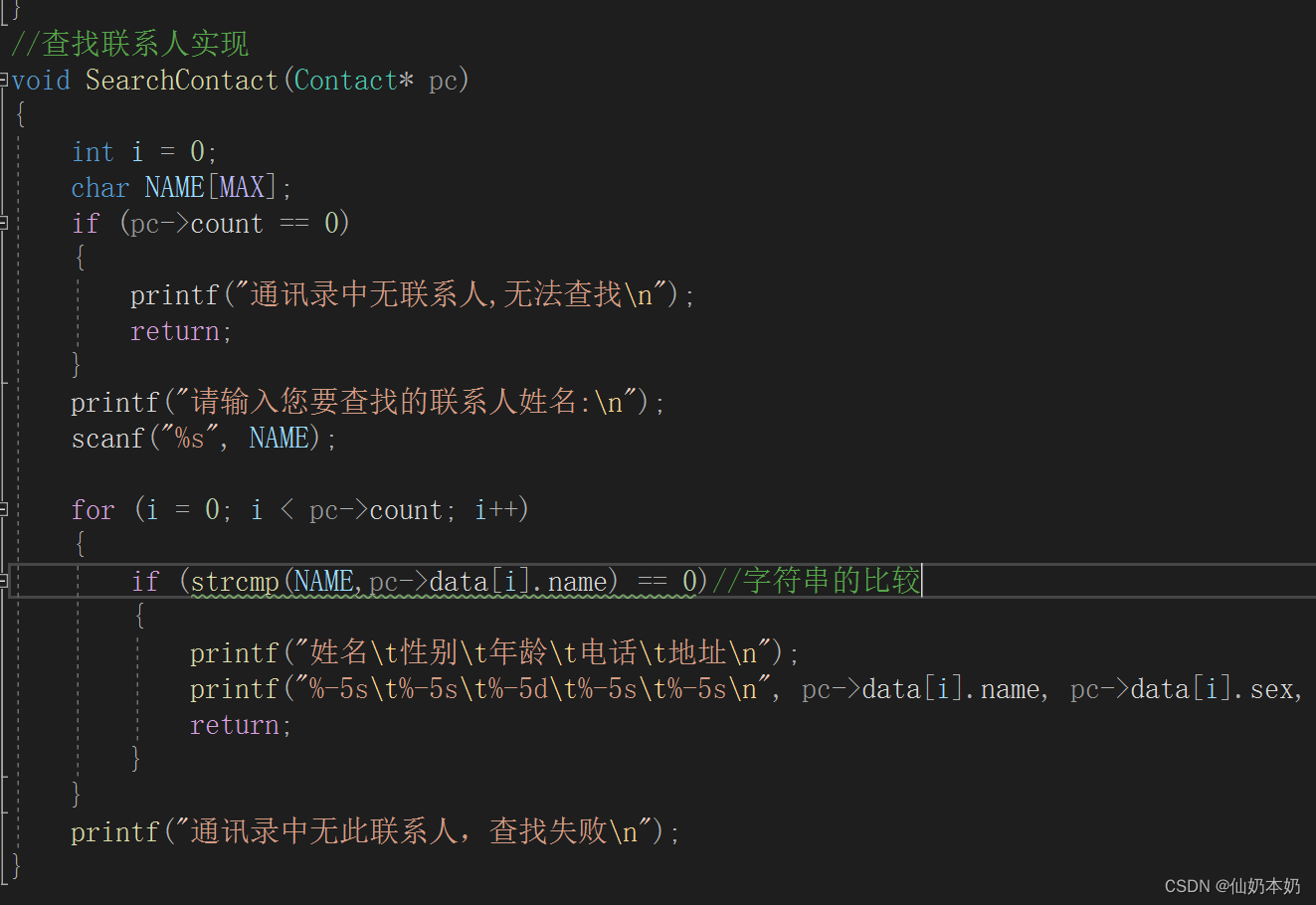 这两个功能我会一起描述,为什么呢?因为无论是删除,还是修改,首先你肯定要知道删除谁,修改谁,因此我们还要写一个函数用来查找删除或修改人的信息存放在数组的哪个位置