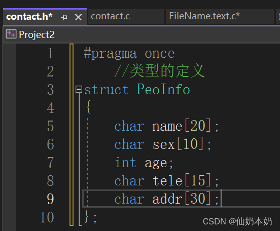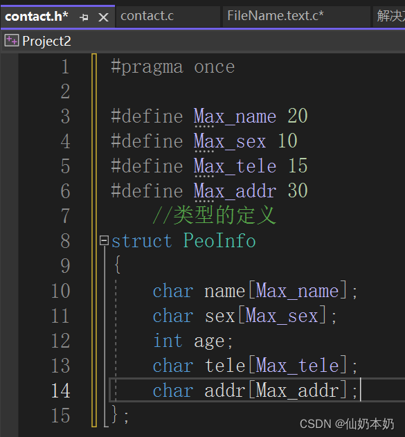 现在我们来敲代码, 根据我们一开始梳理的结构,我们需要创建一个“联系人”类型的结构体,contact.h的文件就是我们用来定义新类型的,因此我们就在这个文件内定义结构体,在别的文件中如果我们想使用“联系人”类型,只需要引用头文件即可