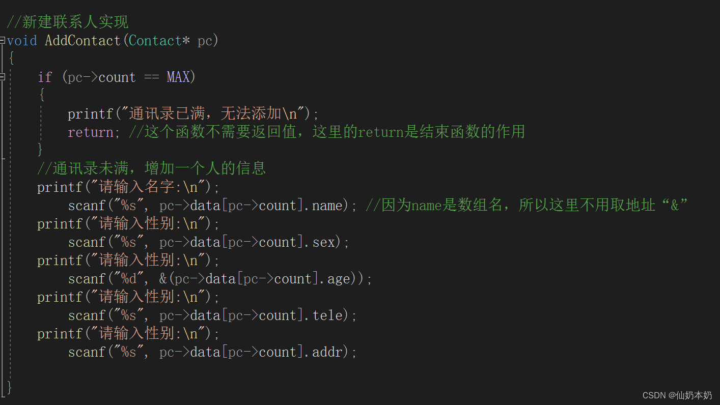 1.通讯录当然要存放很多联系人,而联系人又有姓名,电话,性别,年龄,住址等不同类型的信息需要被存储,因此我在这里想到定义一个“联系人”类型的结构体来存放不同类型的信息